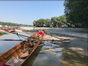 Na een kleine 20 km geroeid te hebben, zochten we een mooi strandje uit voor een boterham, banaan en bakje thee, waarna er werd gelezen, gedut of en een poging werd ondernomen om te zwemmen. Zodra we de andere roeiers zagen naderen, werden ze door ons binnengehaald met een luidkeels Wilhelmus. Nooit gedacht dat het volkslied zo mooi zou schallen over de Donau. Bij aankomst in Mohacs stapten we na een verfrissende douche, maar wel roeibruin, in de bus terug naar Boedapest, waar we de stad nog even konden verkennen alvorens het vliegtuig weer vertrok naar Eindhoven.