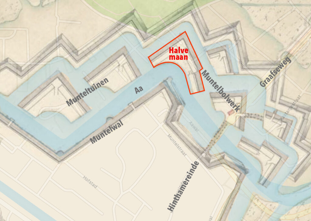 Hier lag vroeger het Muntelbolwerk, ook wel Bastion Muntel genoemd. Het bolwerk werd aangelegd in 1618 bij de uitbreiding van de tweede ommuring van de stad, ter bescherming van de Hinthamerpoort. Het lukte Ernst Casimir niet om hier een bres te slaan bij het Beleg van ’s-Hertogenbosch in 1629. In de loop van de eeuwen zijn de vestingwerken steeds verder aangepast aan de nieuwste militaire inzichten. In 1739 werden er twee halve manen en ravelijnen toegevoegd in de gracht aan de buitenzijde van het bastion. Ze hadden tot doel de saillant van het bastion te dekken (een mooi onderwerp voor het volgende artikel). De halve maan dankt zijn naam aan de naar binnen gebogen muur aan de achterzijde.