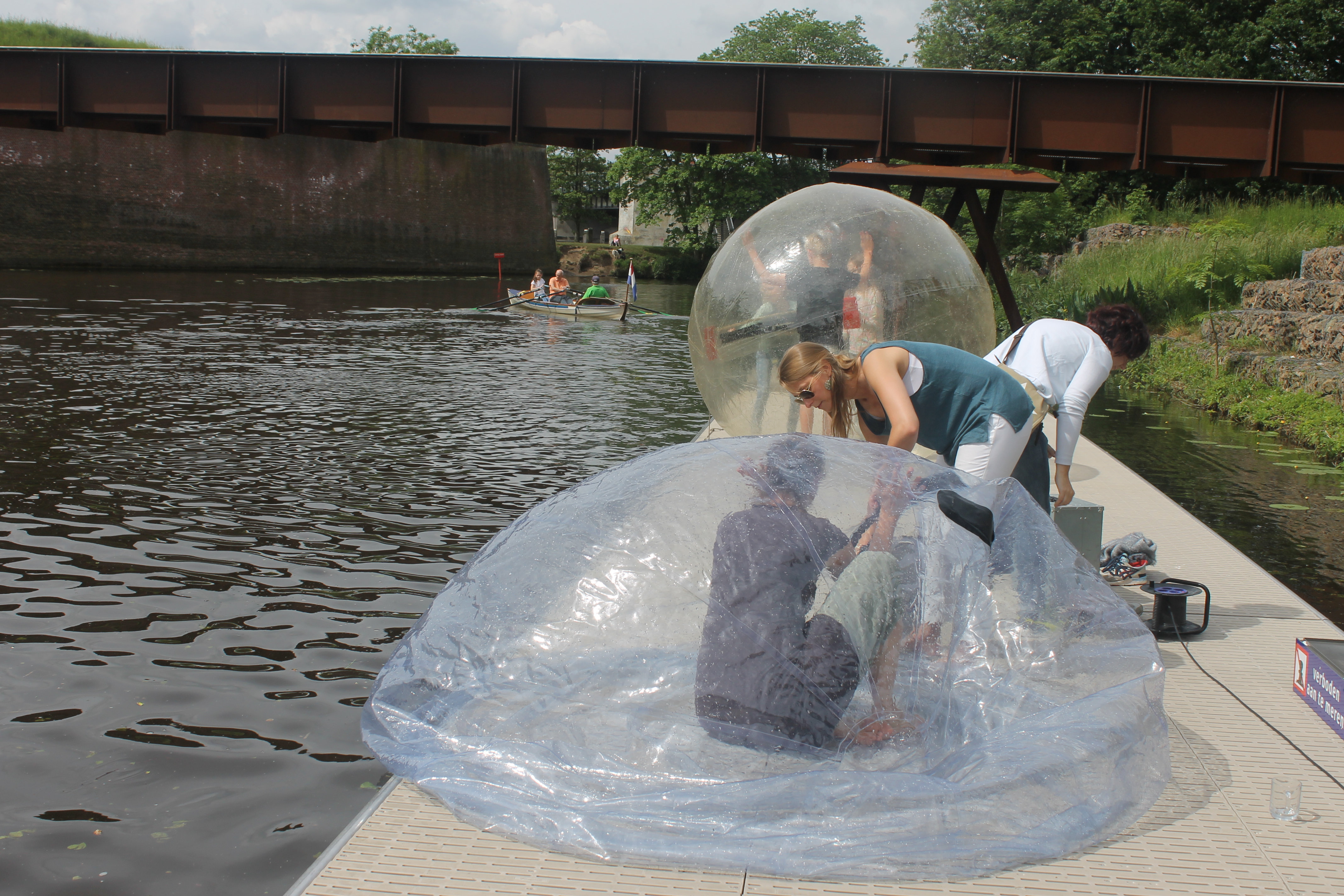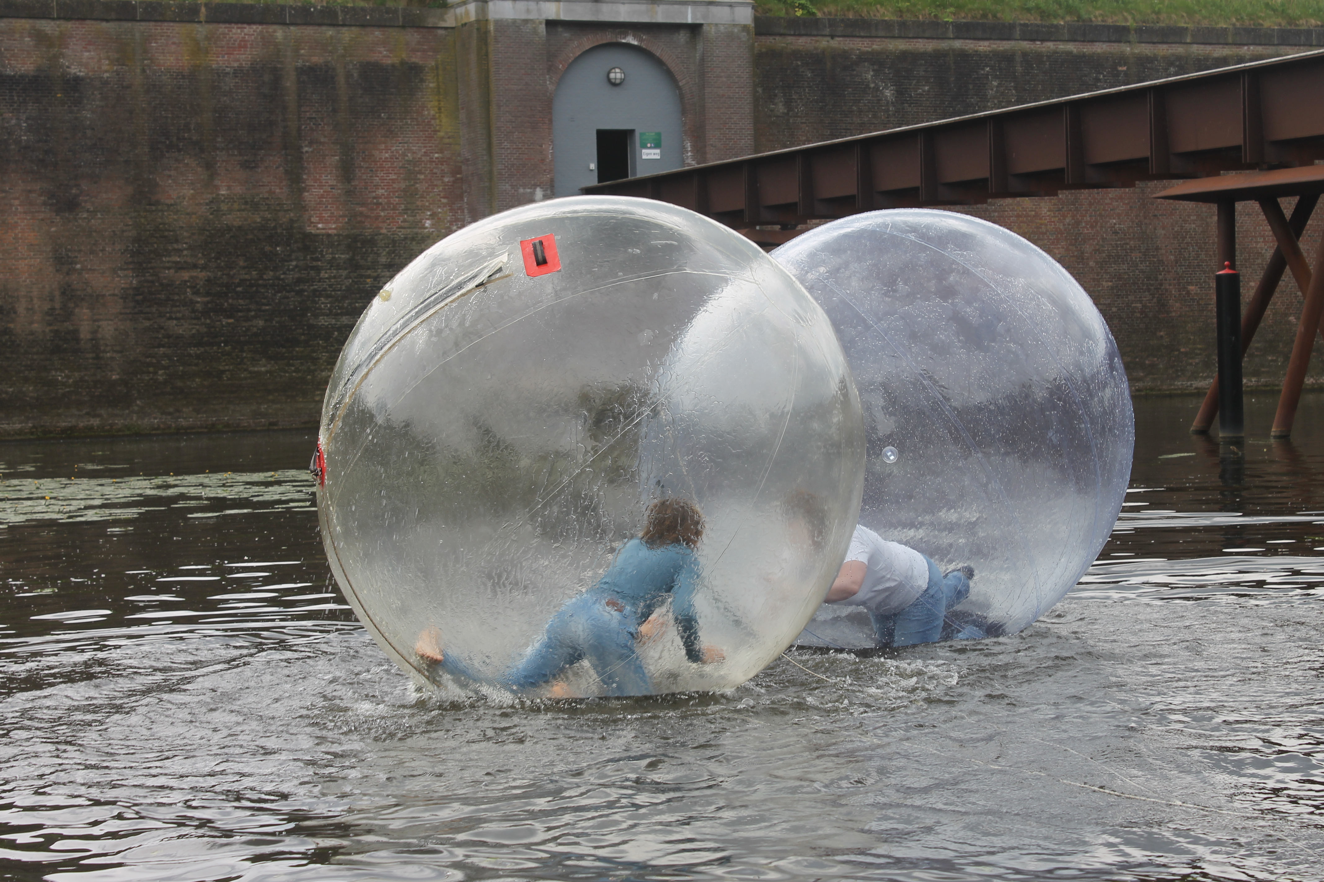 Lopen op het water heeft een wonderlijke aantrekkingskracht: de waterballen vormden dan ook een ware attractie. In twee met ademlucht gevulde ballen kon iedereen zo’n vier minuten lang als een mega hamster over het water rennen. Je hebt in zo’n plastic bal echter niet de grip die zo’n beestje in zijn molentje heeft; het wiebelt en is als een gladde boot, maar dan zonder boorden! In de praktijk was het vallen, min of meer opstaan en vooral veel kruipen en hilarisch rondspartelen. Een keertje ging het even mis doordat de ritssluiting van een bal het begaf. Dankzij adequaat optreden van de begeleiding was er geen moment van angst en kon de onfortuinlijke loopster heel snel worden bevrijd uit de bal, die zich met water begon te vullen. Door het incident had ze het voorrecht om ook alle sanitaire faciliteiten van De Hertog uit te proberen. Gedoucht en voorzien van droge kleding kon ze gewoon verder deelnemen aan de activiteiten en terugkijken op een erg gezellige dag. Echt lopen op water bleef uiteindelijk voor iedereen een illusie.