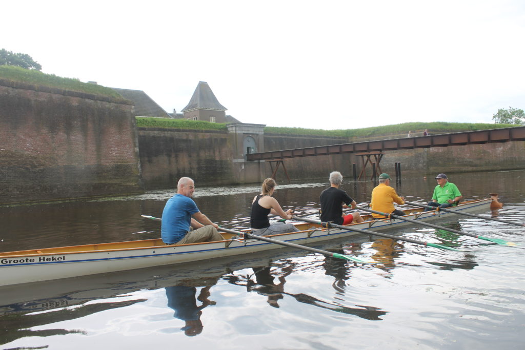De buitenkant van ons markante verenigingsgebouw maakt indruk, dat weten we! De meeste familieleden horen regelmatig over de activiteiten en faciliteiten en vonden het interessant om zelf ook eens in het clubhuis binnen te kijken. In het botenhuis konden ze in het kort een uitleg krijgen over de verschillende boten en het roeien in verschillende samenstellingen. Een blik in de werkplaats van de materialencommissie maakte duidelijk dat boten regelmatig preventief onderhoud en soms helaas reparatie behoeven. Voor de kleinsten was er een mini bad-eenden-race en op de twee ergometers die voor de gelegenheid buiten waren opgesteld, werd menig “wedstrijdje” geroeid. Ten slotte was er de goed geoutilleerde kantine, de naam Hertog Inn dekt de lading beter; vanaf het balkon met de opengeschoven pui was het, kijkend naar de activiteiten op het vlot, goed toeven. Leden van de 5e Stop voorzagen iedereen van een kopje koffie, thee of limonade met wat lekkers. Vanaf 15.00u kon de dag worden afgesloten met een borrel en bitterballen, die vanuit de keuken tevoorschijn getoverd werden. Ja, met een boot, bar en ballen kom je een heel eind.