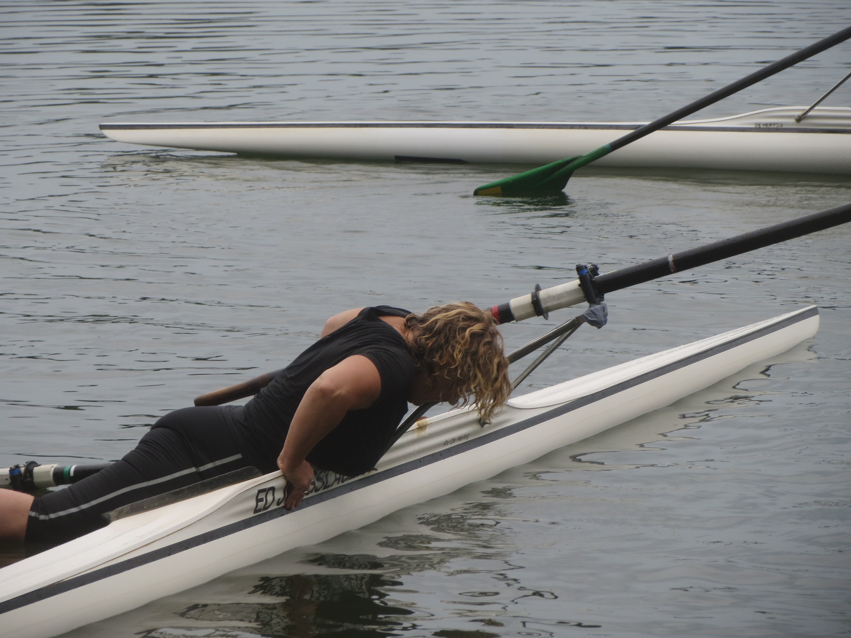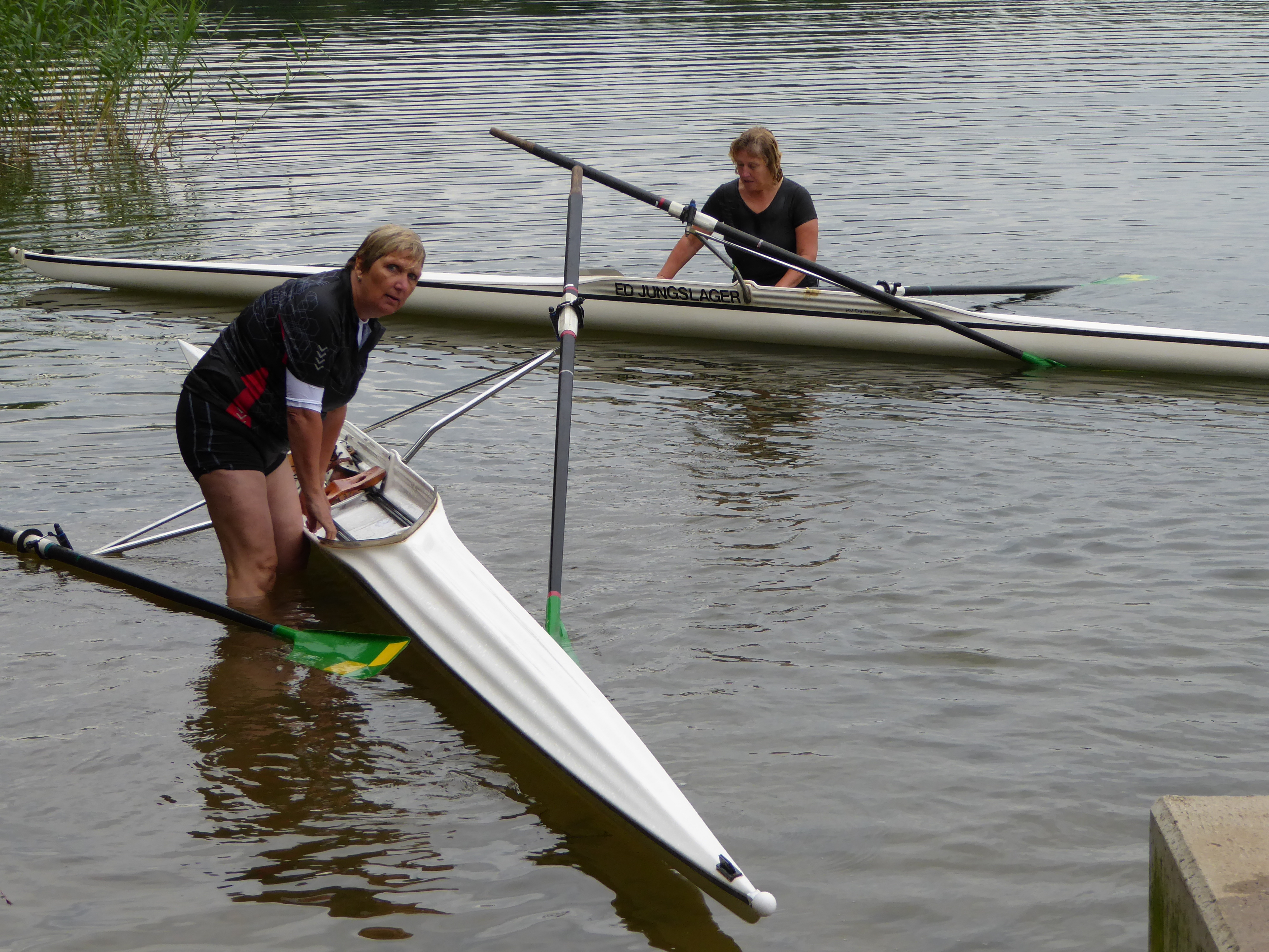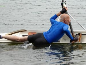 Je ziet er al gauw uit als een verzopen kat. Kleinzerig ook niet: dwars over de boot hangend doe je builen en schrammen op. Maar… je leert ervan. Je ervaart wat je kunt en wat je niet kunt, èn je ontdekt dat omslaan met je skiff niet per se een ramp is.
