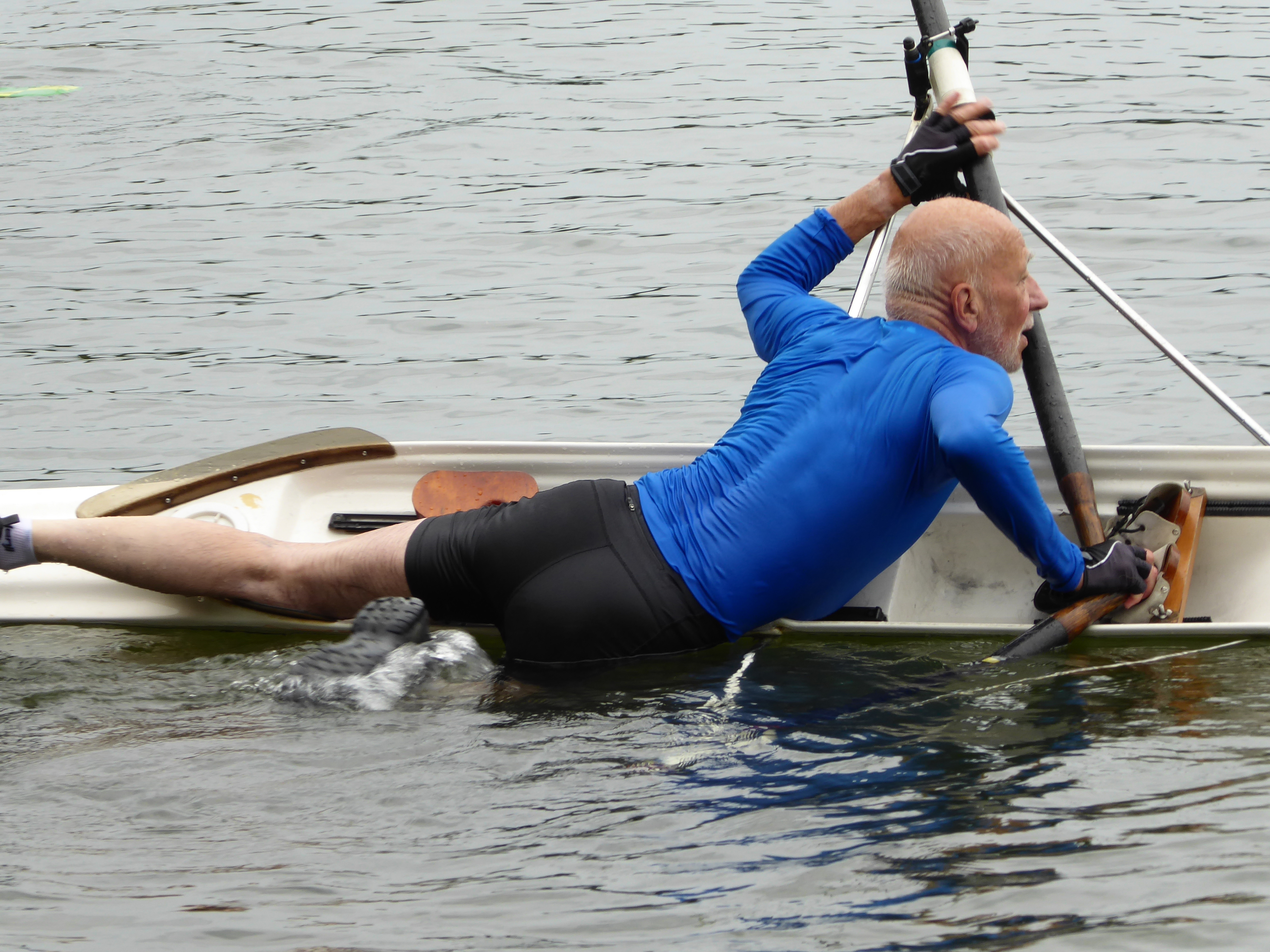 De opzet was: ervaren hoe omslaan gaat, en dan leren waartoe je wel en niet in staat bent. De skiffers probeerden eerst vanuit het ondiepe terug klimmen, daarna vanuit het diepe. Vooral dat laatste was ‘een dingetje’. Dus dat is niet iedereen gelukt…maar de foto’s die dat opleverde, waren onbetaalbaar. Anderzijds waren er een paar waaghalzen die rechtop (nou ja) konden staan in het wiebelding. In het water liggen was geen straf, want de watertemperatuur was zeer aangenaam.
