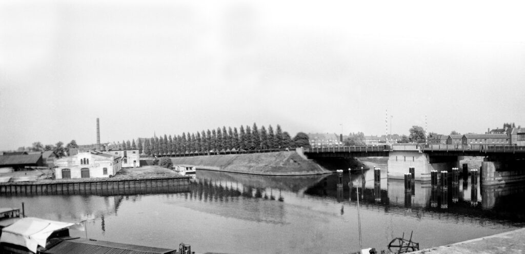 De Diezebrug in 1962 gezien vanaf de Buitendijk. V.l.n.r. De voormalige houtfabriek, de Vaalthaven, bij het Werfpad, die in 1973