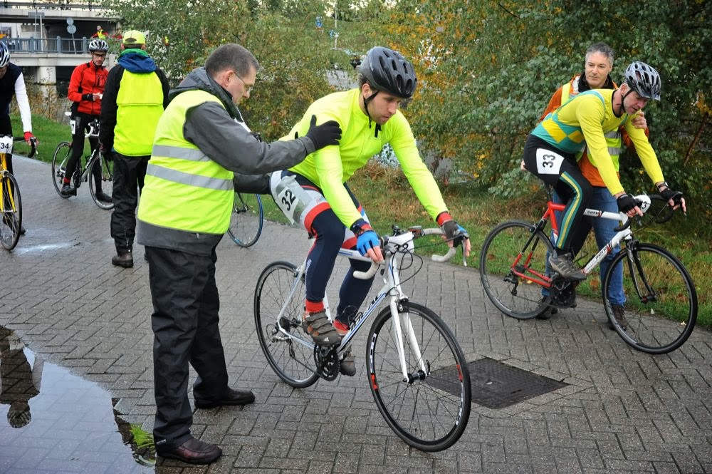 Dag 2 begint vroeg; om 8 uur worden we al ontvangen in Eindhoven. De schaatsen blijven thuis achter en de racefiets gaat mee op de auto. Het is een half uurtje wachten in Eindhoven op de briefing, maar de sfeer is nog steeds aanwezig en heeft gezelschap gekregen van vermoeidheid en pijn. Na de briefing pakken we snel de fiets voor een verkenning van het parcours. De wedstrijd gaat over twee rondjes van ongeveer 5 kilometer. Het is inmiddels droog, maar het parcours is wel nat. Oppassen geblazen dus. Er wordt gereden in drie blokken en ik heb de eer om als eerste van het tweede blok te mogen starten. Omdat ik weet dat er mensen zijn met triathlon- of tijdritfietsen vrees ik dat dit betekent dat ik vooral het lijdend voorwerp van inhaalacties zal zijn als deze plaats zullen vinden. Om niet als een volslagen idioot voor de dag te komen besluit ik zo hard mogelijk van start te gaan en te zien waar het schip strandt, in de hoop dat dit na de race is. Ik wil in ieder geval Jan-Willem achter me houden die meteen na mij zal starten. Het startsignaal klinkt en ik sprint uit de blokken. Na een paar honderd meter zie ik 43 km/u op de teller staan en hoewel het wind mee is, wordt dat toch wat te gortig. Ik bind in naar 39 km/u en dat voelt goed. Ondertussen nog niet ingehaald en na 2 km komt de eerste bocht. Als ik over mijn schouder kijk zie ik nog niemand naderen, dus dat gaat goed. Ook in de volgende kilometers zie ik niemand achter me en dat komt de moraal ten goede. Met wind tegen loopt de snelheid wel terug naar 33 km/u en doet de inspanning van de dag ervoor zich voelen. Na het eerste rondje wordt ik ingehaald en inderdaad: triathlonfiets. Ik denk: EPO? Bloedtransfusie? Is er eigenlijk dopingcontrole na het fietsen? Maar ik besluit geen kwakken uit te delen en omdat stayeren ook verboden is rijd ik in eigen tempo door. Dit tempo ligt in het tweede rondje wel iets lager, maar dat geldt blijkbaar voor iedereen, want op die ene tegenstander na zie ik verder niemand achter me. Na een meer dan fatsoenlijke eindsprint kom ik over de finish. Na deze inspanning zit ik om met Maarten Ducrot te spreken ondersteboven op mijn fiets om mijn moeder te roepen. Toch voel ik me zeer content met de geleverde prestatie en na mezelf binnenstebuiten te hebben gehoest kan ik weer lachen.